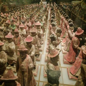 陕西省西安市,国庆黄金周期间,陕西历史博物馆内展出的300余件明代彩绘陶仪仗俑群。