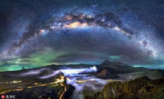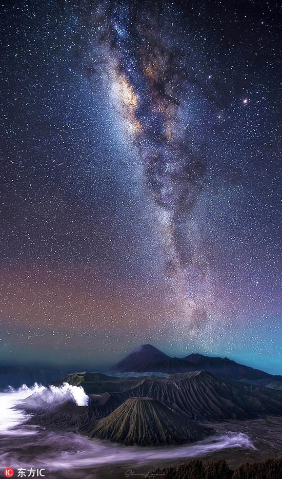 摄影师Steve Lance Lee旅行马来西亚和印尼等地,拍摄了一组银河和火山的风光照,璀璨的银河在沉静的火山上方架起一座闪耀的星桥,绿色和橘色的光芒点亮了幽蓝的夜空,星光熠熠美到令人窒息。