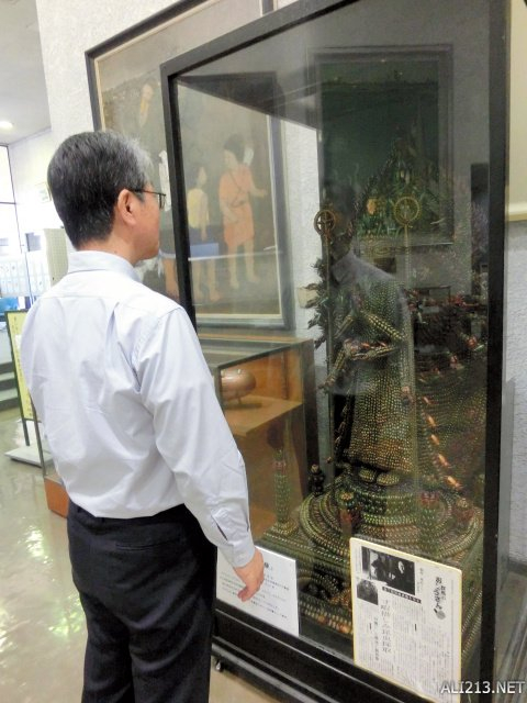 据报道,这尊昆虫观音像高约1.5米。1975年,当地居民稻村米治(现年97岁)耗时5年完成。最近,这尊作品重新获得追捧。当时稻村米治在铁路公司工作,在帮孩子搜集昆虫和制作标本时,萌发了用昆虫做一个立体人偶的想法。由于稻村认为锹形甲虫前足的钳状部分和观音的手指相似,遂决定做成千手观音像。