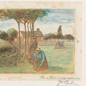 图为卡米耶•毕沙罗彩色铜版画《Les Baigneusesgardeusesd‘oies》,估价30,000-50,000美元(约合人民币202,944-338,240元),图片由美国纽约斯旺画廊提供