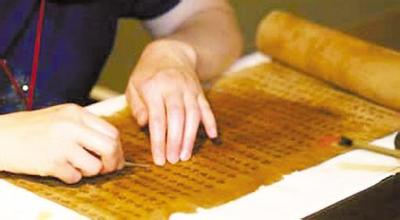 记者在现场看到,还有一册《大方广佛华严经》,为明泥金写经,天头、地脚处有较严重虫蛀,书心保存良好,泥金字体部分未被伤及。纸张强度较好,但书页粘连处糨糊已失效。本书修复难点在于配纸,有专家认为该经抄纸为名纸羊脑笺,有专家认为是瓷青纸,其纸张表面经过打蜡处理。此次修复项目拟对此经进行修复。
