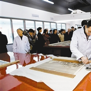 宋纪蓉先介绍了故宫文物医院的情况。去年年底,历经两年建设的故宫文物医院终于揭开神秘面纱。故宫文物医院坐落于故宫西院墙内侧,建筑长度达361米,建筑面积1.3万平方米,地上和地下各一层,从空间上整体划分为6大区域。文物医院中间有一个宽敞的长廊,两边都是修复区域。在这所特别的医院里,书画、木器、漆器、金属等多种文物的损伤均可在此修复。文物来到这里真像病人走进医院,也要“挂号”“分诊”,“治疗”完毕后再出院与观众见面。