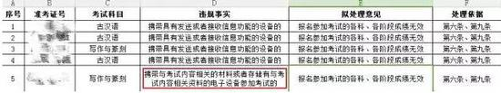 在事件发生之后,小编登录校方官网进行查询,发现在校方发布的《2017年XX美术学院本科专业校考违规考生处理公告》中有2名书法专业的考生被处理,其中一名考生的“违规事实”一栏中标明“携带与考试内容相关的材料或者存储有与考试内容相关资料的电子设备参加考试”,处理结果为“报名参加考试的各科、各阶段成绩无效”。
