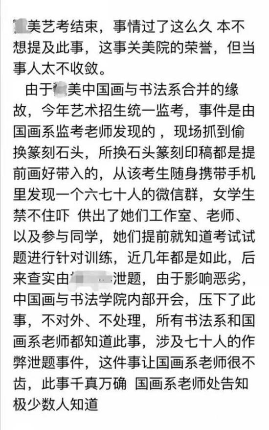 令人心寒的是,艺考“黑幕”几乎年年都有,且似乎不分地域和学校。回溯到2014年,江西某画室被疑泄露艺术联考考题。