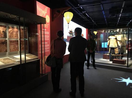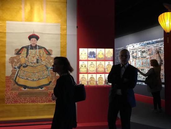 记者在现场看到,整个展厅以中国红为主色调,巧妙嵌入灯笼、龙纹、木雕、立柱等中国元素,精美的图示、照片与展出文物融为一体,给观众带来震撼的视觉感受。此外,展览还展出了乾隆皇帝宝座和朝袍,康熙皇帝的头盔和棉甲,以及香几、屏风、文房四宝等物品。