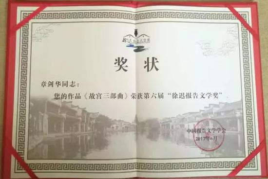 第六届“徐迟报告文学奖”评选作品范围是2014年至2015年间,在中国大陆用汉文写作并公开出版发表的写实性文学作品。本届评奖,共300多部作品申报,经过评选,最终确定5部长篇、3篇中短篇作品获奖。章剑华长篇报告文学《故宫三部曲》获奖。在颁奖典礼上,黄宗英、理由荣获“中国报告文学创作终身成就奖”,周明、傅溪鹏荣获“中国报告文学事业终身贡献奖”。