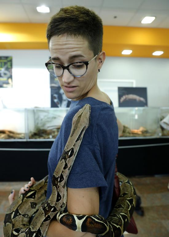 7月1日,在克罗地亚萨格勒布,蛇类“收藏家”内文·弗巴尼奇展示手上缠绕着的一条牛奶蛇。