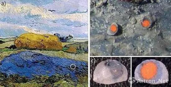 研究员利用显微镜分析了梵高1889年创作的作品《云空下的干草垛》(Wheat Stack Under a Cloudy Sky)的颜料样本,发现画中池塘上一块红叶表面已分解成灰色和白色,但表面之下的颜料仍是鲜红色。