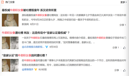 然而近期,陕西师范大学历史学教授于赓哲微博发文称,最标准的牛郎织女塑像,汉武帝开凿昆明池时所置,牛郎像在西安市长安区斗门镇常家庄村北,织女像在斗门镇棉纺厂内,两者间距约3公里,看来当年布置时将昆明池当做天河了。