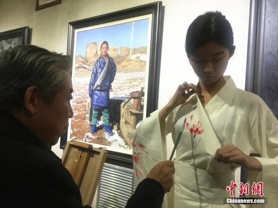 10月18日下午,王秀章丝绸之路主题油画创作展在兰州展出。当日,王秀章携手五名甘肃籍画家,用各色颜料在身着汉服、唐装的模特服装上进行手绘,极短的的时间内勾勒出牡丹、彩陶等富有中国元素的作品。史静静 摄