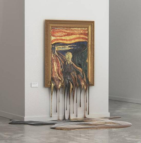 AlperDostal的“调皮之作”汇集了各个时期艺术大师的名画。这些画作,都在他巧妙的创意加工下,像夏日里冰淇淋融化后流出蛋筒那般,从画框中流到了地面上,糊成一团。