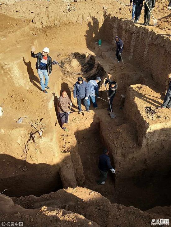 古墓发掘现场,四座被发掘的墓室纵横不一,三座呈东西走向,一座呈南北走向。其中一座墓室格外显眼,周围土质呈黑色,与其他三座墓室相比较为特别。整个墓坑距离地表五六米深,10余名工作人员正在进行发掘工作。其中,数名工作人员正用小铲子小心翼翼地清理着墓室周围的土壤。