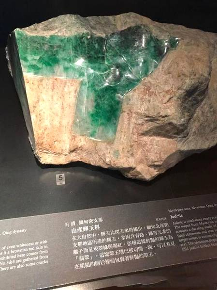 博物馆三楼展厅展示的翡翠原石,虽然只是开了一部分口,但是挡不住翠色的呼之欲出。