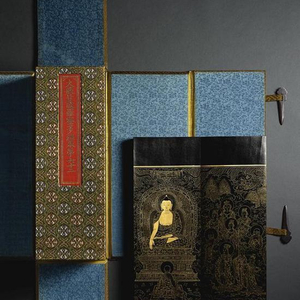 现见十卷《大般若经》,经折装,磁青纸本,裱以羊脑及顶烟墨制,漆黑亮滑,犹如明镜,是为羊脑笺,色泽含蓄静谧,配以泥金书写、制图,历久弥坚,是以为宫廷御制佛经专属。磁青纸本泥金经文,以台阁体书写,字体工整端庄,清朗秀逸。此册内经牌赞与佛说法图等,有别于泥金经文,乃是羊脑笺上浅刻勾勒,再细笔填金,彷如戗金漆金,细致入微。