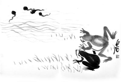 他画两只青蛙,俩蛙在岸上望着水中远去的蝌蚪,似父母送娃远去,眼中有依依不舍之情。