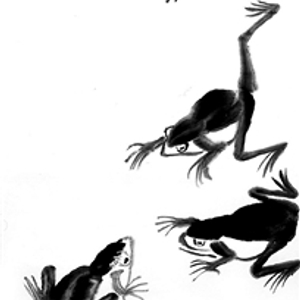 他画三只青蛙,俩蛙看着一蛙游来,这似乎是上一幅画的后续——游子归家了。