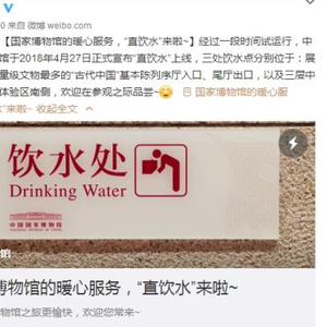 4月27日,国博官方微博正式宣布“直饮水”上线。国博官网也显示,为进一步提升观众的参观体验,国家博物馆免费为观众提供直饮水。