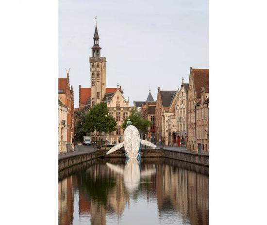 在今年主题为“流动的城市”的比利时布鲁日艺术与建筑三年展Bruges Triennial 上,美国STUDIOKCA事务所从太平洋撤出了5吨塑料废物,用这些海洋垃圾变成了一个 4 层楼高的鲸鱼雕塑,作品名为“摩天大楼(布鲁日鲸鱼)”,以跃姿鲸鱼的被安置在比利时城市的主要运河中供游客参观,这一令人印象深刻的装置作品旨在让人们关注海洋中数量巨大的塑料废弃物等海洋垃圾坏境问题。