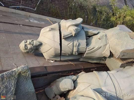 记者注意到,第一次洪峰过后,宜宾相关负责部分才对其进行了修复。这次雕塑是连同底座一起倒下。两个雕像都有不同程度的开裂。其中一个头部已经断开。