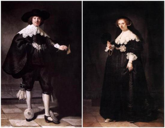 伦勃朗,(左)《Marten Soolmans》和(右)《Oopjen Coppit》,1634,208x132cm。图/取自wikimidea