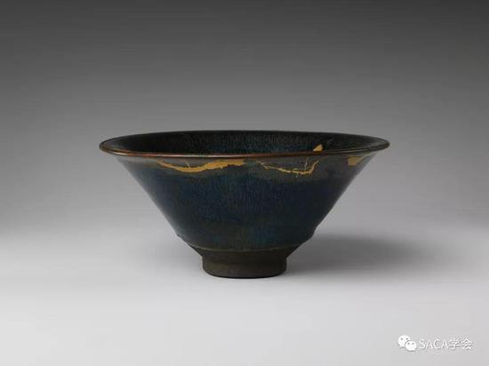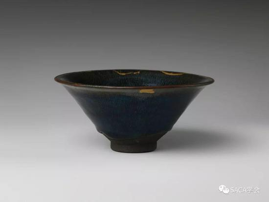 这件斗笠盏作品,口沿虽有若干处修复,但其自身彩光引人入胜,蓝绿交接中带着紫光与暗红。大都会为这件作品拍摄了许多不同的角度图片,可见其品相丝毫不影响博物馆专家对其认知与重视程度。可见当建窑茶盏在超越一定级别后,关注其自身无可替代的优点比关注完整度更为明智。