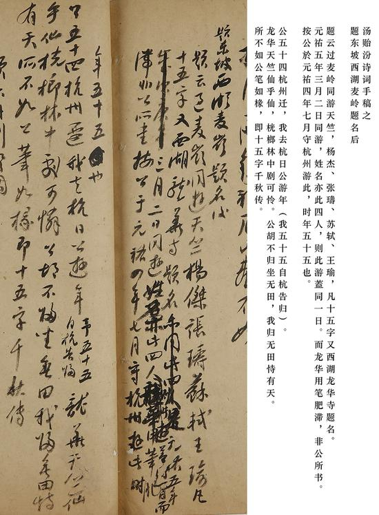 道光七年(1827)汤贻汾任湖州协镇,常往来于湖州、杭州之间,参加了杭州当时颇具影响力的东轩吟社。道光十二年(1832)汤贻汾从杭州归武进,即诗注“我五十五自杭告归”。在杭州期间,他观览了大麦岭那块被认为最著名的苏轼题诗原刻,抒情的同时也作了一番比对考证。大麦岭题名刻石从南宋施谔编撰的地方文献《淳佑临安志》以来,在主要的西湖史籍均有著录。此刻不书年月,但据汤贻汾曾经的长官、学者阮元(1764-1849)考证:“同游三人与龙华题名同。又与咸淳《临安志》所载韬光题名同,二刻皆元祐五年三月二日,此一时之书,故不复纪年云。”对题刻的时间,汤贻汾判断与阮元一致,元祐五年即苏轼第二次莅杭之时,根据汤氏的习惯推算了苏轼的年龄,两相比照,慨叹党禁的严迫,“公胡不归坐无田,我归无田恃有天”。