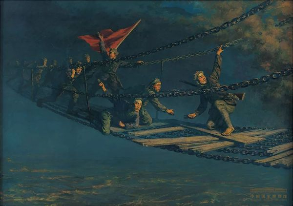 油画《强夺泸定桥》是李宗津1951年的作品,画面生动地再现了红军战士抢渡大渡河的英勇场面。画面中,突击队员手持冲锋枪,背插大刀,腰缠手榴弹,脚踩铁索,向对岸敌人冲去。后面的战士背着武器,手挽木板,冲过火海。作者以博大恢弘的气势,赞颂革命英雄主义的精神,创作了这一历史性的画卷,将红军战士视死如归的大无畏精神表现得淋漓尽致。