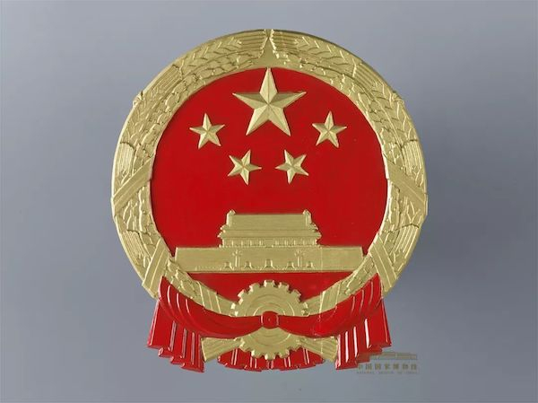 1950年6月28日,中央人民政府委员会第八次会议通过了中华人民共和国国徽图案。图案由国旗、天安门、麦稻穗和齿轮组成,象征中国人民自五四运动以来的新民主主义革命斗争和工人阶级领导的以工农联盟为基础的人民民主专政的新中国的诞生。