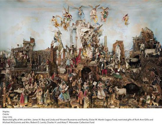 Crèche一词意为“耶稣诞生场景”。这幅来自意大利那不勒斯地区的《耶稣诞生场景》(Crèche)虽然描绘的不是弗罗斯特集市,但也反映了十八世纪中期的西欧热闹的圣诞市集。这个繁茂的场景由超过200个物件组成,其中包括至少50个动物牲口和41个食物,这些物件被放置在一个巴洛克风格的绘制背景前。
