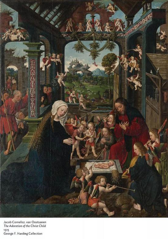 耶稣基督的诞生在早期绘画大师(Old Masters)的作品中是一个非常经典的主题。雅各·科内利斯·范·奥斯坦纳(Jacob Cornelisz van Oostsanen)的作品《朝拜圣婴》(The Adoration of the Christ Child),体现了圣婴诞生时的情景。根据《圣经》里的故事,奥斯坦纳描绘了耶稣诞生时的马厩,而在四周奏乐的天使和环绕的来自各个阶层的人群表达了对圣婴耶稣的崇敬。这幅作品创作于1515年,中世纪末期与文艺复兴前期交接的时刻。这幅画的笔触与符号体现了文艺复兴时期浪漫的特质。
