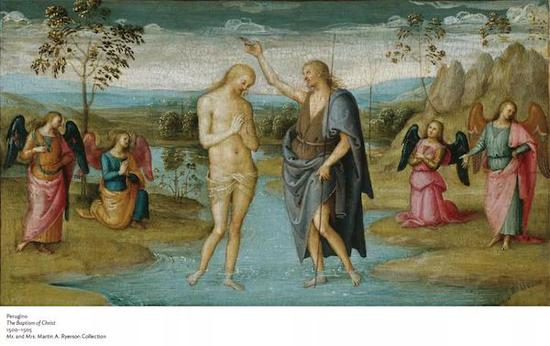 这时期的艺术品主要为教会与权贵创作,比如这幅意大利艺术家佩鲁吉诺(Perugino)的《耶稣受洗》(The Baptism of Christ),是四幅描绘耶稣故事的具有叙述性质的小画,装饰在教堂祭坛底座上。