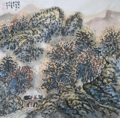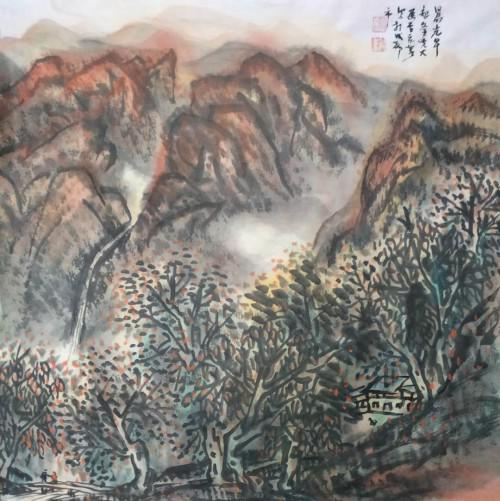他的山水固然也笔墨中来,笔墨的运用也颇具功力与老辣,但他同时也十分重视色彩的表现。如果说,笔墨在皴擦中容易呈现厚重和力量的话,那么宋智明却在此种皴擦中去运用色彩。他喜欢使用厚重的石色,注重在见笔见色的笔色表现之中去表达对现实山川的真实感受。由于宋智明的色彩运用是以笔墨的表现原理为基础,加之其色彩本身又是以古拙老辣而浓重的笔墨骨线为底而施加的,所以他的山水既不失传统笔墨的神韵,又有色彩的明艳与浓丽,同时其石色的反复皴擦,又使画面色彩带上了国画特有的朴拙敦厚和油画般的丰富与凝重。这当然使宋智明的山水画既大异于传统水墨山水,又异于时流之山水套路,因而带上鲜明的个人风格特色。