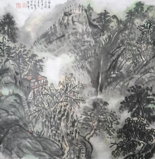 同时那众多皴、点的层层积染,笔意深厚,墨韵郁然,形成了传统笔墨的新境界。智明还善于在大山大水中穿插一些精细的楼台、道路以及雾、瀑布,以使浓密深茂的山岩丛林灵活而透脱。画幅之虚实疏密,实属匠心营构。就是以山水之一角一隅,在智明的独到处理中亦能气势夺人。如他的《青城山四景》条屏画截取局部,满密列天的独特结构就是一例。