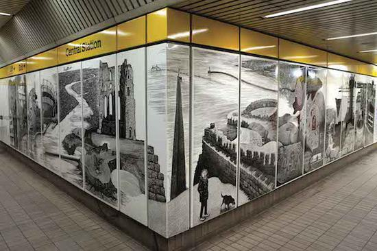 希拉里·佩特Hilary Paynter (1943年生)的作品被放大做成纽卡斯尔中心火车站长廊大幅壁画,图片摄影©Tom Willingham