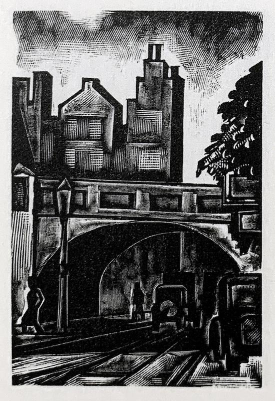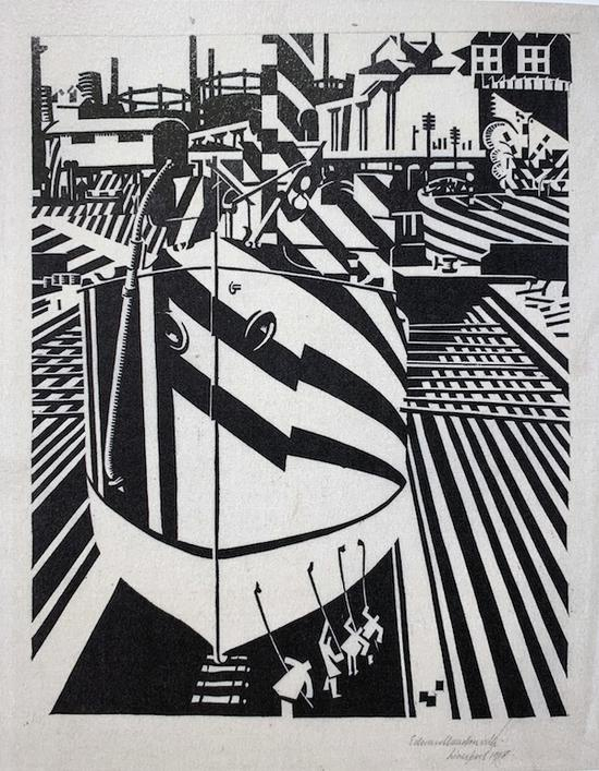 英国是世界上第一个实现工业化的国家,同时也是第一个实现城市化的国家。虽然进入二十世纪,城市化成为一个有争议的课题,但建设与摧毁等场面仍然吸引了众多木口木刻家去表现。爱德华·沃兹沃思(1889-1949)被公认为刻画人造环境最有代表性的艺术家。他主张艺术与工业相结合,作品可以说是涡旋主义未来主义与立体主义的综合体。在第一次世界大战中,他参与了将炫目的迷彩设计画到皇家海军的舰船上迷惑敌人,并在战后继续以航海题材为主题。