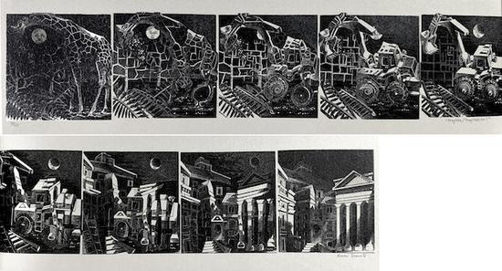 安妮·黛斯梅特,《演变/进步?》,1989-90,9件木口木刻,柠檬木,©Anne Desmet。图片摄影©Tom Willingham