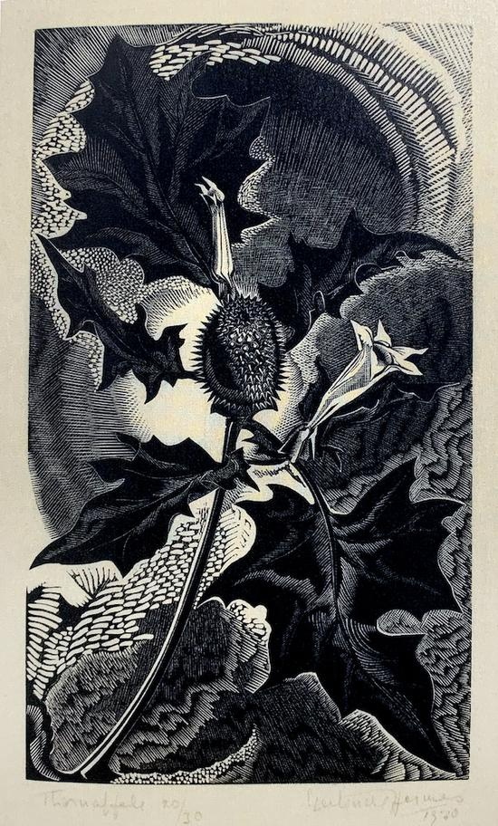 或许由于英国的地域面积和自然资源极为有限,所以英国人对自然珍爱有加。英国有着航海掠夺珍稀植物的不光彩历史,也有从皇家到平民园林设计的荣耀。艺术上出现了诸如康斯太勃尔,透纳等专门描绘风景的大师。木口木刻家继承并发展了这个传统,展厅中最精彩的几件木口木刻作品都在这一部分,其一是乔治·图特(1933年生),他在六十年代刻制的《野地蒲公英》等黑白层次技法上可谓登峰造极;另一位莫妮卡·朴沃(1921-2003)在作品中融入了装饰化的超现实因素,她几乎以一己之力将现代木口木刻推向了一个新的高峰。