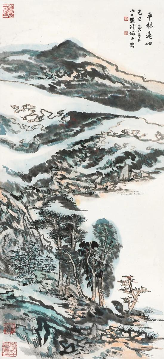 题识:平林远岫。己巳春二月,八一叟陆俨少写。
