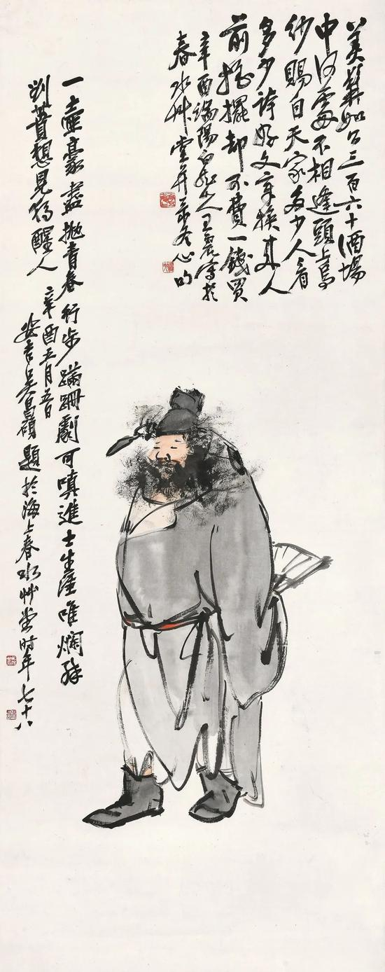 2。(吴昌硕题)一壶豪尽抛青春,行步蹒跚剧可嗔。进士生涯唯烂醉,刘蕡想见独醒人。辛酉五月五日,安吉吴昌硕题于海上春水草堂,时年七十八。