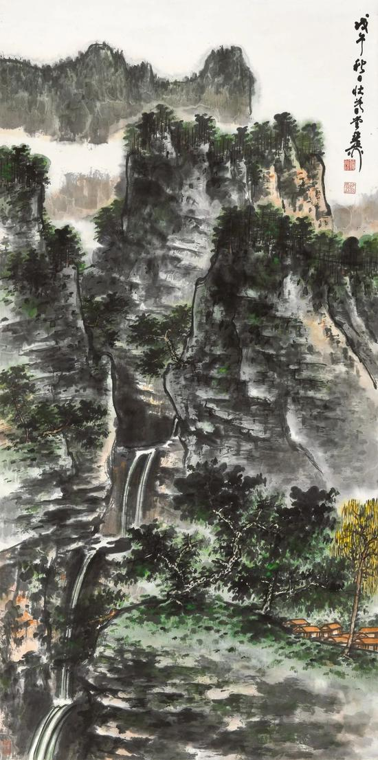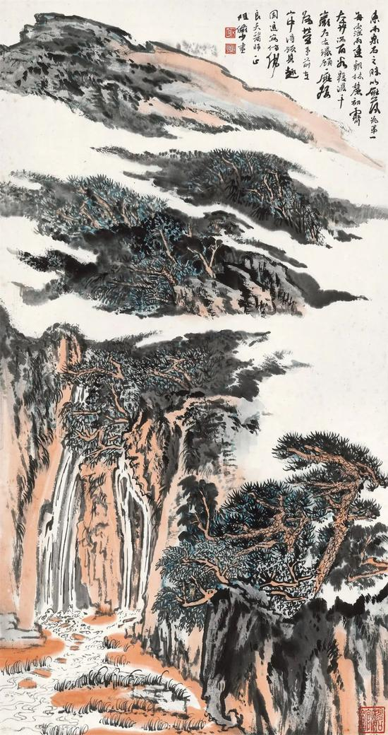 谢老晚年的作品,笔墨纯熟,功力深湛,《青山飞瀑》为四尺整幅,前后层峦重重,流云飞瀑穿插映带,山体以素墨、赭色、绿色配合而成,形成微妙的光感。