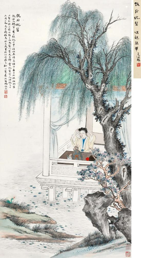 冯超然堪称全能,仕女、高士、山水、花鸟俱精,他以仕女画成名,早期延续改琦、费丹旭的风格,之后上溯至唐寅、仇英,得益于深厚的造景能力,冯超然的人物画蕴含着古雅的气息。