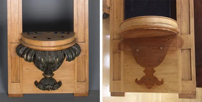 管风琴面板的细节。左图,这部分已经完成。右图,装饰物从风琴上取下。暗色的区域因被遮挡没有接触过阳光,所以没有褪色。注意颜色的差别有多大!