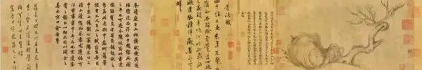 首先有东坡同代书画家 - 米芾(1051-1107)的跋,跟着有宋高宗赵构(1107-1187)‘绍兴内府’的印,以及南宋(1131-1204)金石学家王厚之的印。大宋灭亡后,元初著名书画家鲜于枢(1246-1302),以及元末诗文家俞希鲁都曾在上面题跋。据鉴藏印显示,至有明一代,则曾为朱元璋养子沐英(1345-1392)家族,和藏书家李廷相(1485-1544)所藏。2018年,苏轼的水墨画《木石图》创下了亚洲佳士得拍卖最高价,世人对他作品的关注程度可见一斑。