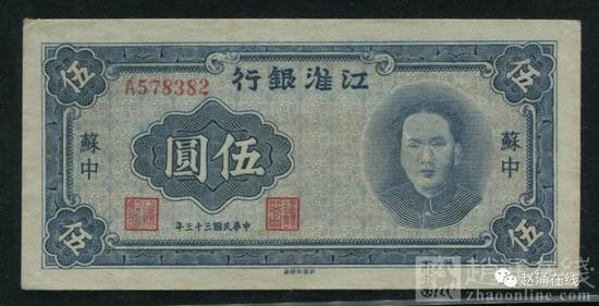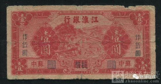 民国30年江淮银行抗币苏中地名壹圆改作伍圆一枚
