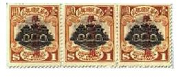 这是中华民国邮政在新疆发行北京一版帆船票上加盖“限新省贴用”邮票时出现的错体票。中华民国邮政时期,因各地币制不同,币值相差悬殊,为防止从低币值地区购买邮票到高币值地区谋利,特在邮票上加盖“限×省贴用”字样,如“限新省贴用”、“限滇省贴用”、“限四川贴用”等。1915年,中华邮政在发行“限新省贴用”邮票时,全套共16枚,其中面值1元的帆船邮票采用红色加盖“限新省贴用”字样,其余均为黑色。在加盖1元帆船票全张50(10×5)枚中,其中有1枚因排字工人粗心,把“限新省贴用”中的“新省”二字颠倒,因此造成“限省新贴用”错体票。传说这种错体票是一位侨居上海的外国人首先发现的。他从新疆迪化(今乌鲁木齐)邮局函购“限新省贴用”邮票100套,在清点邮票时,发现面值1元票中有1枚“限省新贴用”错体票。于是,他又写信并汇款给新疆迪化邮局,要求把全张中仅有的1枚错体票,连同3枚正体票撕成四方连,无论有多少,均全部购下。迪化邮局接到这位外国人来信后,检查面值1元票全张中,果然有1枚错体票,当即将这种错体票全部撕下,上交销毁。在回收这种错体票中,仅有少数流出,后被集邮者列为“民国四珍”之一(见图三连票中央的1枚)。