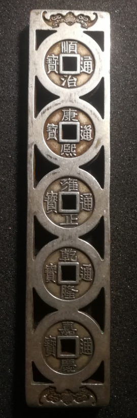中国古代民间一直有用古钱币驱邪的习俗。史载,将方孔通宝钱不拘大小,以红线悬于颈间,取铜钱历经万人手之实,汇集百家之阳气,可抵御邪祟鬼魂。