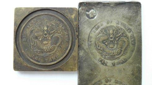 试压银条。将标准厚度的饼坯烘软,压印凸边后,准备压印花纹时,为了保证产品(银元)的质量,必须要试压。试压成功后,才能投入正常生产。早期一元银元 (26.73克)的机器压力是140吨—160吨。当年中央造币厂生产船洋(26.7克)的机器压力是160吨,速度每分钟100枚。如果压力不足, 银币上的花纹、镜面就会出现“弱打”现象,质量受到严重影响。民间私铸的银元,因受设备、技术的限制,往往过不了这一关。试压银条上都标上“试”字,以示区别。一般来说,试压以后的银条,都被当作废品回炉,重铸,极少流出厂外。所以今天我们能见到的试压银条是少之又少!更何况这种保存着原始铸造痕迹的东西,是历史上最好的实物见证!它具有很高的历史价值和研究价值!