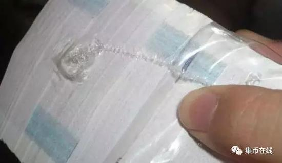 像下图一样把中间的币尽量往两边推,露出一定的币面就可以看到正面冠号(如果里面冠号和上面第一张一样那就没问题),正面的凹印手感线 ,背面气泡点,这样既不用拆包还能看到里面到底是99版还是05版,但是不要把包装推破啦如下图(此方法适用于任何99版原捆纸币):