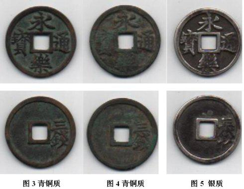 (图4)所示永乐通宝背三钱,青铜质,铜质精细,铜色暗红。生坑,绿锈满身,间有红斑,包浆熟旧,古色古香,铸工精整。直径34.6mm,厚2.4mm,重13.7克。