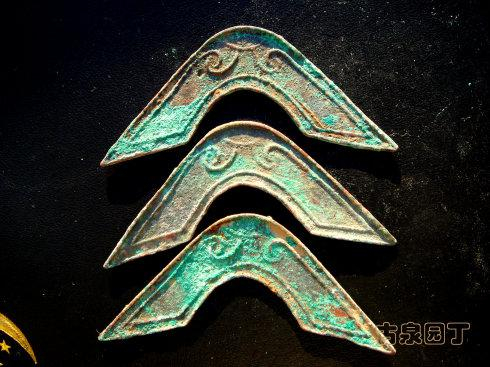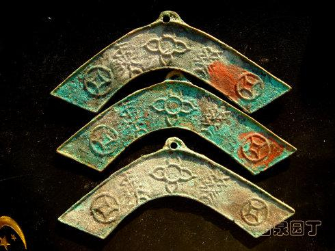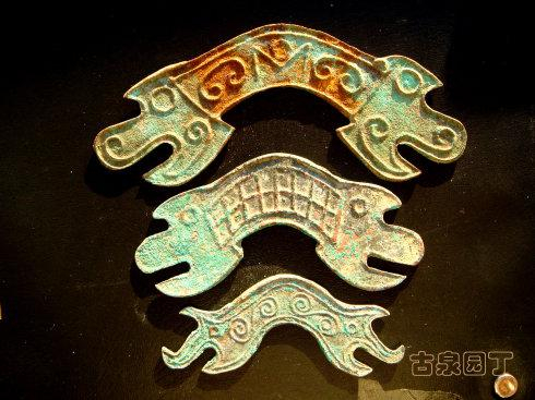 三种大小的兽头罄币。大的长度 124毫米,中型 96毫米,小型